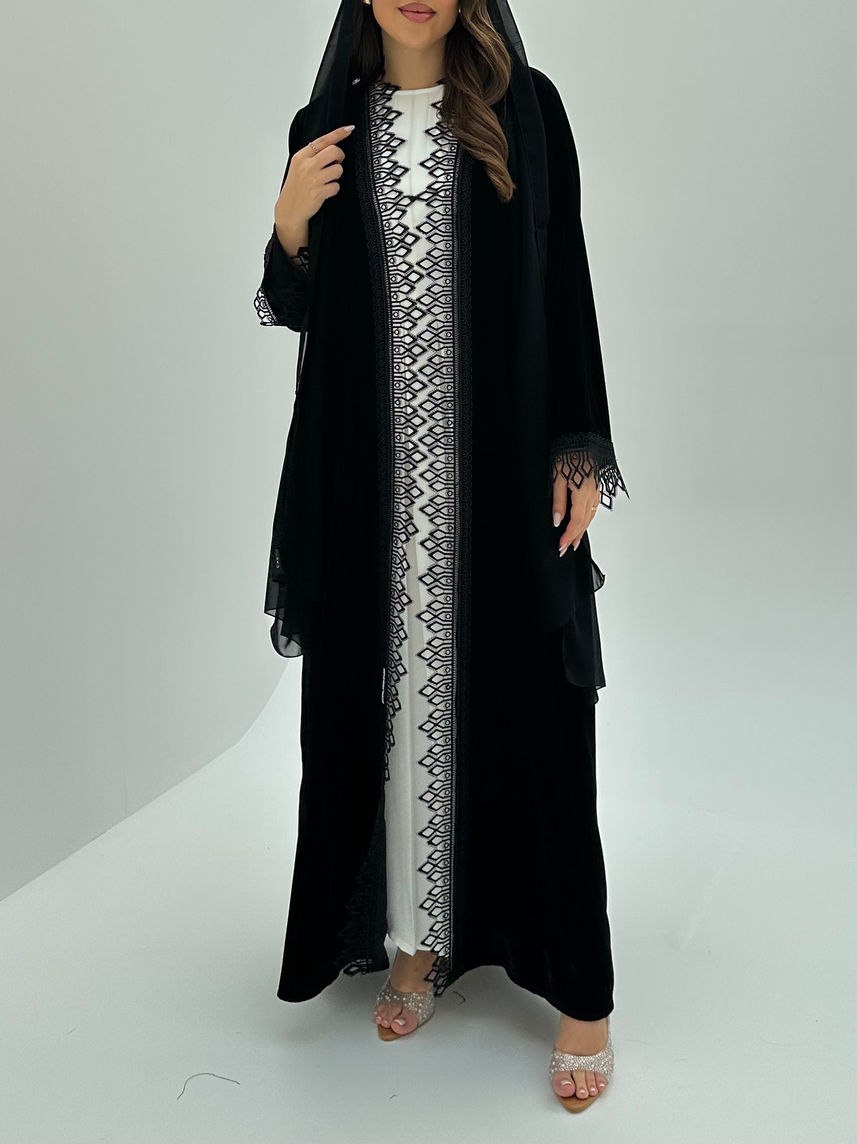 Black Velvet Lace Abaya by CAS Abaya is the epitome of luxury and sophisticated Emirati fashion. Crafted from premium velvet, this Dubai abaya offers a soft, plush texture with a graceful drape that exudes elegance. The intricate lace detailing enhances the rich black fabric, adding subtle glamour and a refined silhouette, perfect for evening events, formal gatherings, and elevated modest fashion styling.