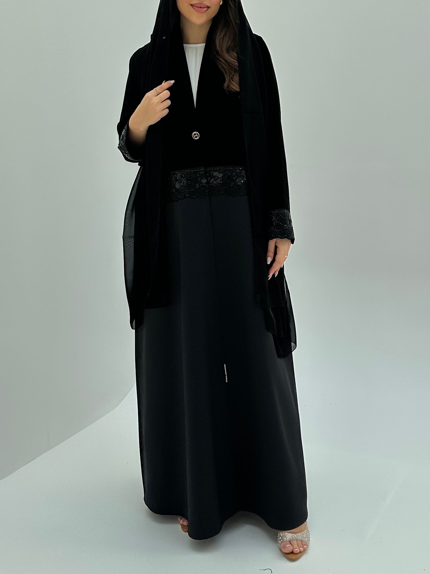 Black Velvet Beaded Abaya by CAS Abaya is a stunning fusion of luxury and Emirati elegance, crafted from premium bridal satin. Its smooth, glossy texture creates a flowing, sophisticated silhouette, while intricate beadwork adds subtle sparkle and refined detailing. Perfect for formal events, weddings, and evening occasions, this Dubai abaya elevates modest fashion with timeless style.